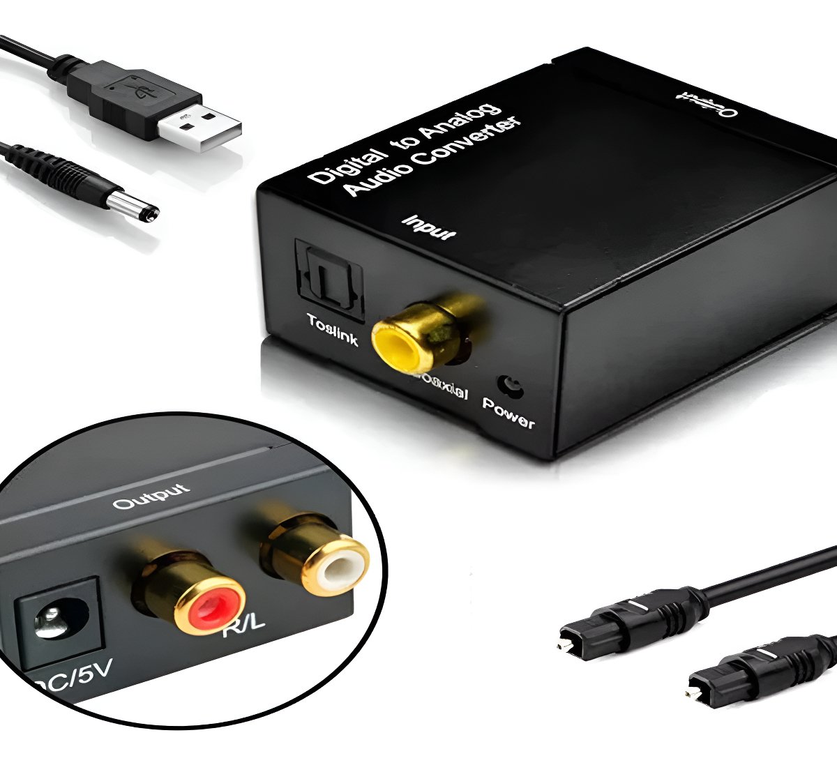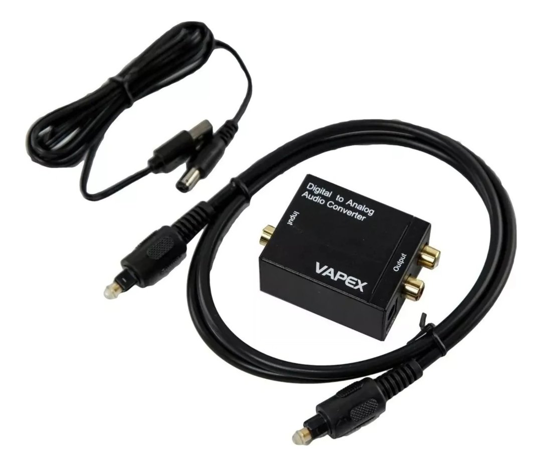 Conversor de audio digital óptico (1 x toslink) o coaxial (1 x RCA) a audio analógico estéreo (2 x RCA).