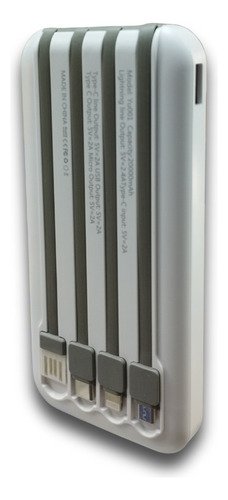 – Conectividad: Incluye cables de salida Micro USB (V8), Tipo C y Lightning (iPhone), más un cable USB para la recarga del propio Power Bank.