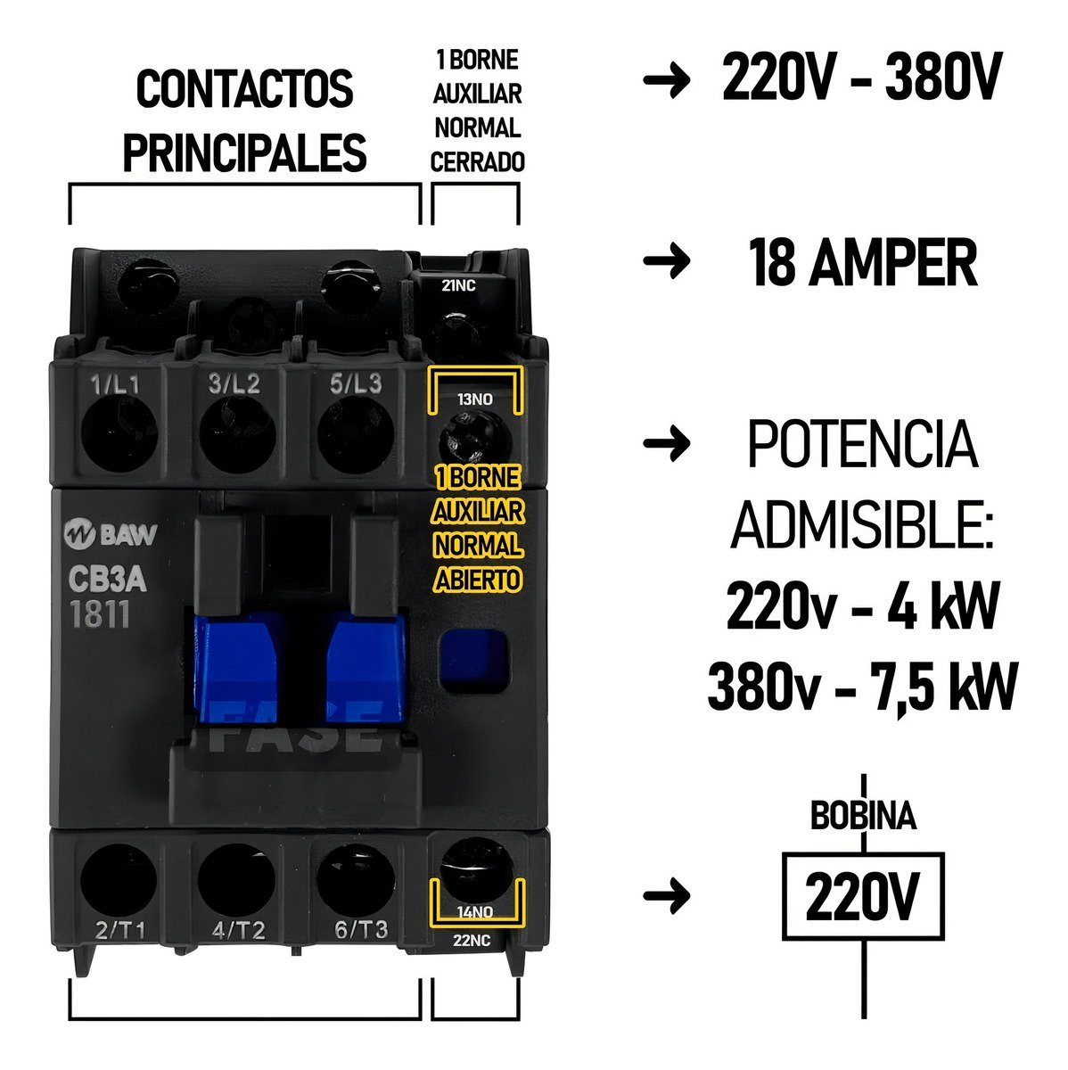 Contactor 3P. 7,5kW AC3 18A 1Na+1Nc Bobina 220Vca 50-60Hz
