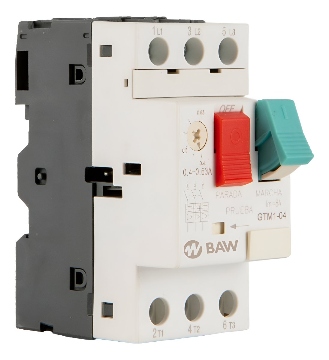Interruptor automático tripolar termomagnético para la protección de motor asincrónico 0,12kW. 380Vca. Ie: 0,4-0,63A. 50-60Hz. IEC 60947-2. Ventana y fijación DIN.