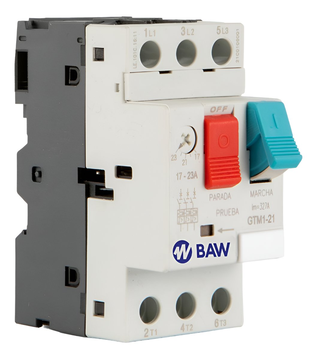 Interruptor automático tripolar termomagnético para la protección de motor asincrónico 9kW. 380Vca. Ie: 17-23A. 50-60Hz. IEC 60947-2. Ventana y fijación DIN.