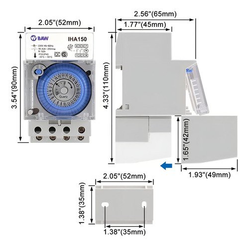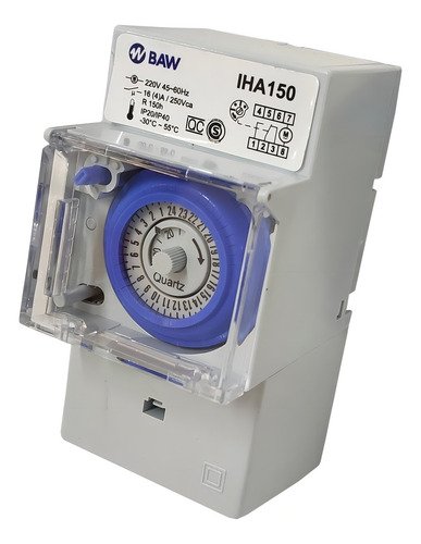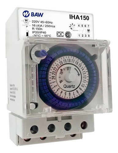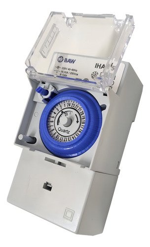 El interruptor horario analógico BAW modelo IHA150 es ideal para automatizar el encendido y apagado de equipos eléctricos en forma diaria, permitiendo un control eficiente del consumo energético. Su funcionamiento es simple y confiable, con programación mecánica por intervalos de 30 minutos.