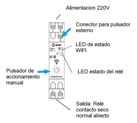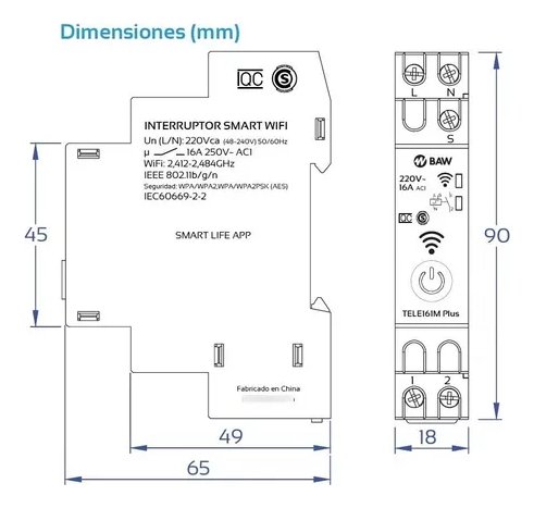 Un: 48~240Vca. Contacto NO 220Vca-3600VA-16A. WIFI 2,4Ghz 802.11b/g/s. Control de iluminación y dispositivos eléctricos mediante teléfono inteligente o tableta, mediante APP “SMARTLIFE” para iOS y Android. Vinculación con Alexa o Google. Interruptor ON/OFF: Manual y horario. Temp. TELERRUPTOR.