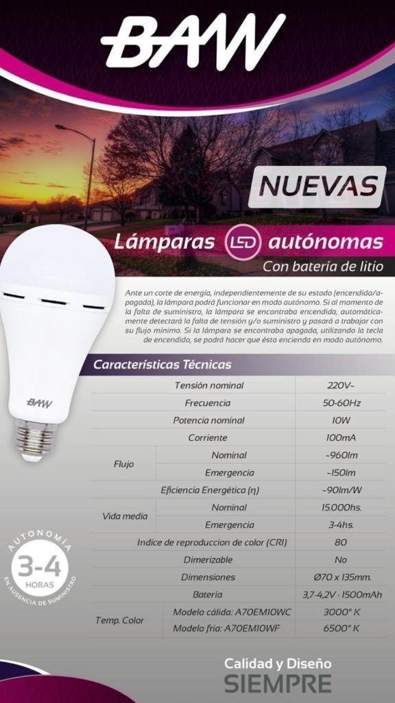 Tensión nominal: 220V~. Frecuencia: 50-60Hz. Potencia nominal: 10W. Flujo: 900lm/180lm (nominal/emergencia). Temp. Color: 6500° K. Autonomía: 3-4hs. Dimensiones: Ø70 x 155mm. Batería: 3,7V-4,2V · 1500mAh
