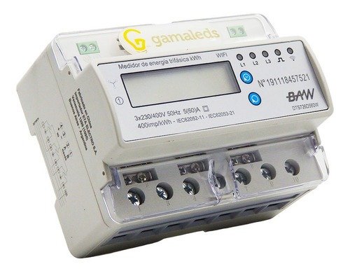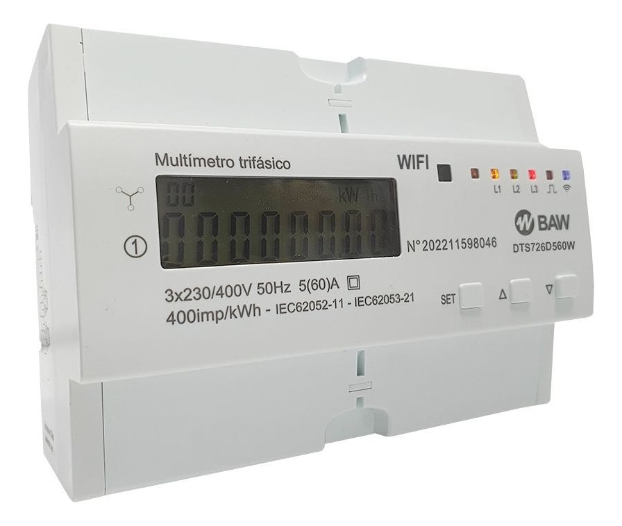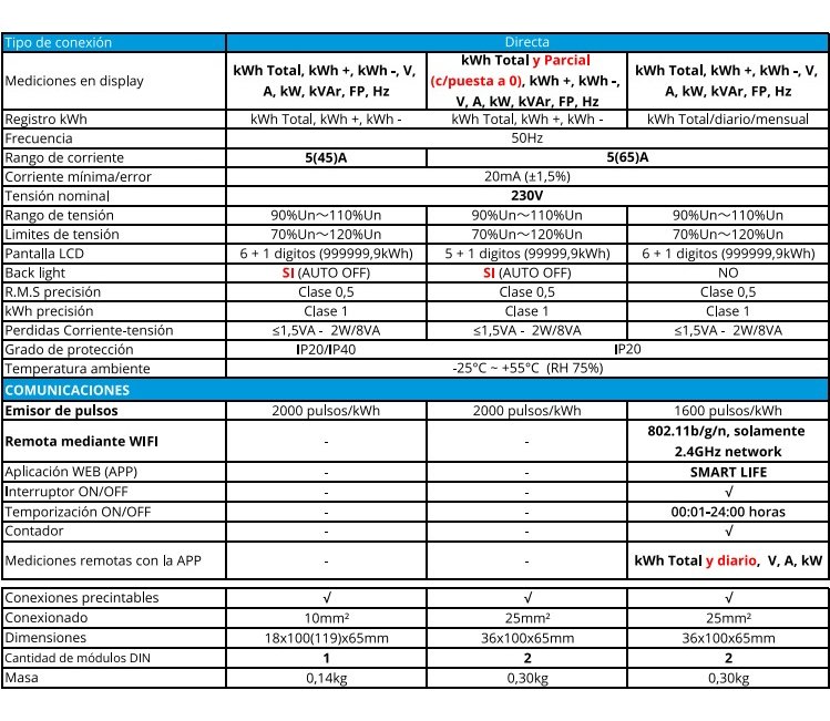 Pantalla LCD 6 + 2 dígitos (999999,99kWh). Mide: kWh total, kWh +, kWh -, V 3 fases, A 3 fases, kW total, kW 3 fases, kVAr total, kVAr 3 fases, FP, FP 3 fases, Hz. Conexión/desconexión programable. 7 módulos. Cl 1. Comunicación mediante WiFi, APP SMART life. RS485 y pulsos: 400imp/kWh. IEC 62053-21.