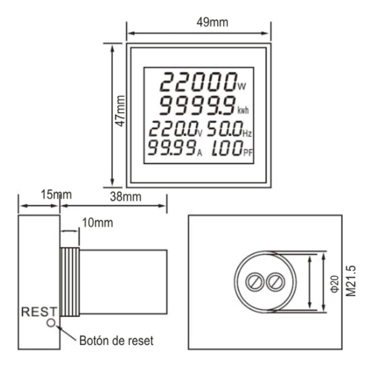 Pantalla LED de alta definición en colores con medición simultánea de: 50,0-300Vca, 0,01-100,0A, 45-65Hz, FP, 0,01-45000W, energía activa 0,01-9999kWh. Fijación en panel, orificio 22mm. Dimensiones: 49x47x52mm. Provisto con Transformador de intensidad toroidal externo ext/int: 32/15mm.