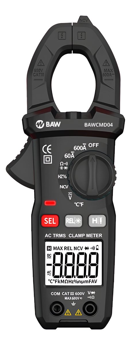 Pinza de medición digital True RMS. Rango automático. Display 3¾ dígitos 5999 cuentas. Retención de lectura, buzzer, continuidad, prueba de diodos. Pantalla retroiluminada e indicación de batería baja. NCV Detector de tensión s/contacto, autoapagado. Apertura de mordaza Ø26mm. Normativa de seguridad: EN61010-1,EN61010-4-034, Cat III 600V.