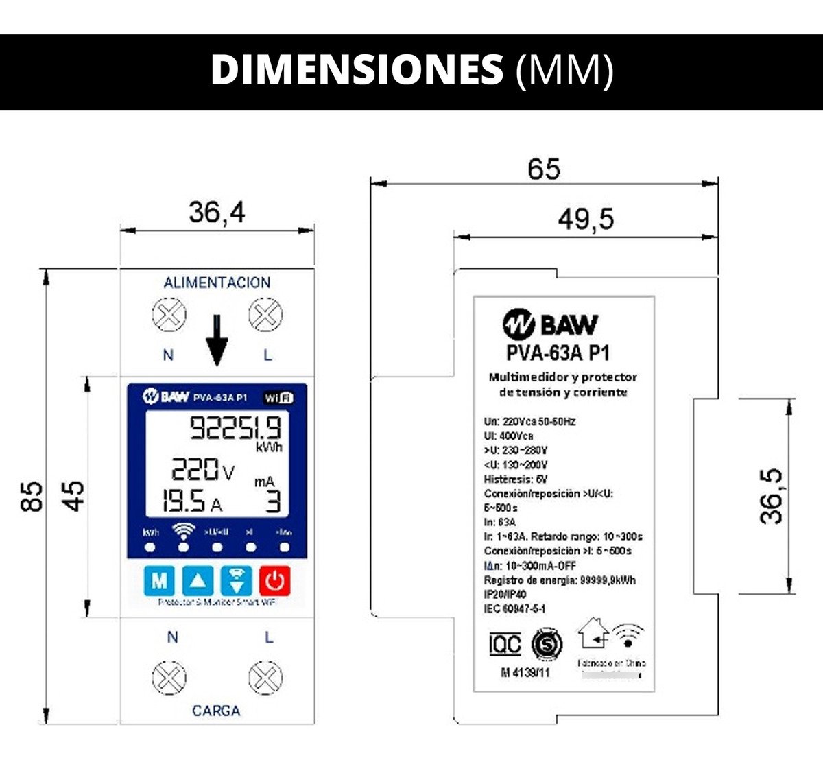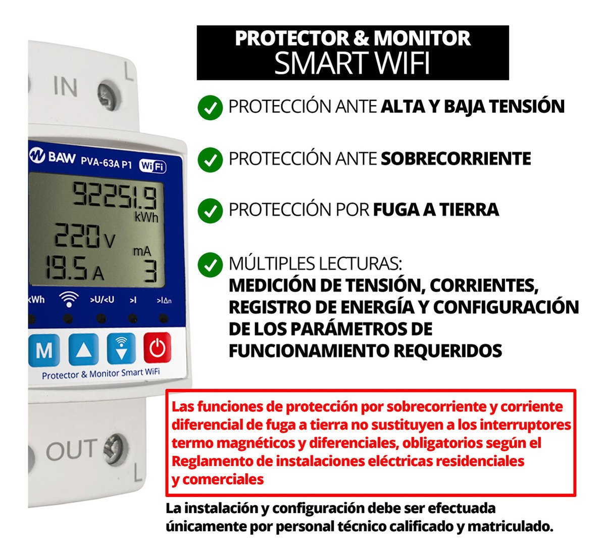 Las funciones de protección por sobrecorriente y corriente diferencial de fuga a tierra no sustituyen a los interruptores termo magnéticos y diferenciales, obligatorios según el Reglamento de instalaciones eléctricas residenciales y comerciales.