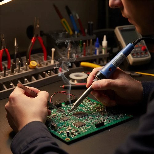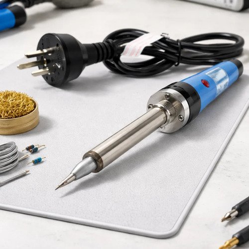Soldador tipo pistola ideal para trabajos de electrónica y reparaciones, con sistema de potencia variable mediante botón de accionamiento para mayor versatilidad.