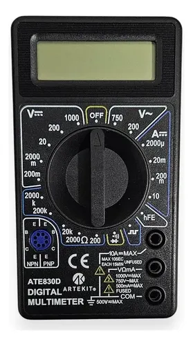 Multimetro digital Artekit ATE830D ideal para mediciones electricas precisas. Cuenta con funciones completas para uso tecnico y domestico.