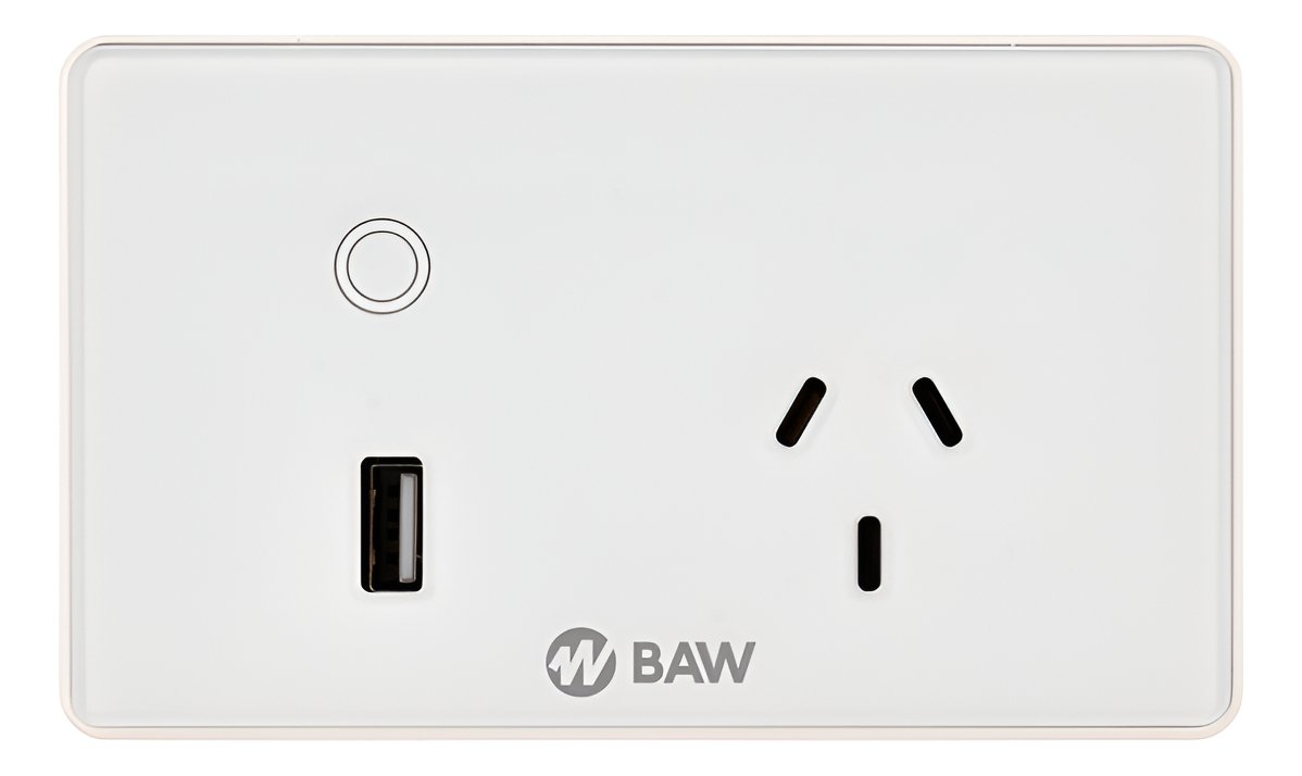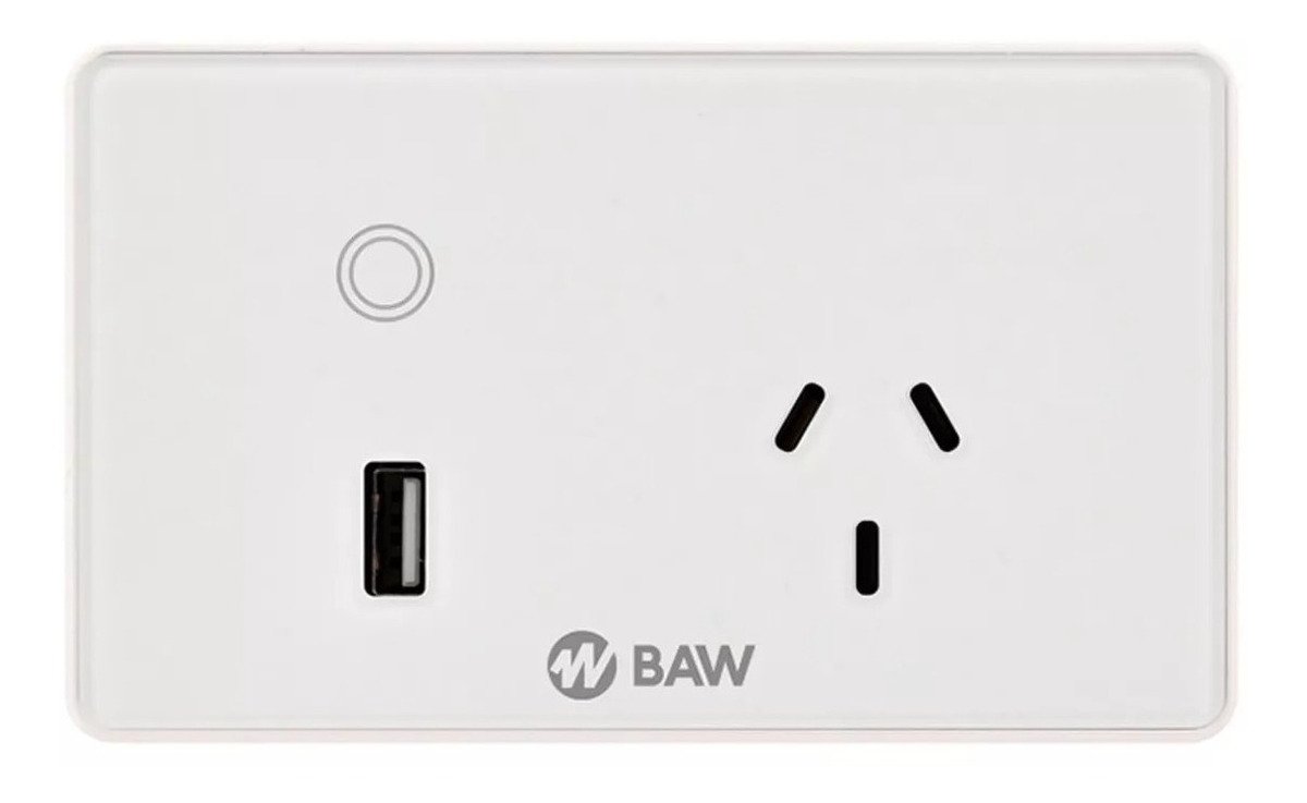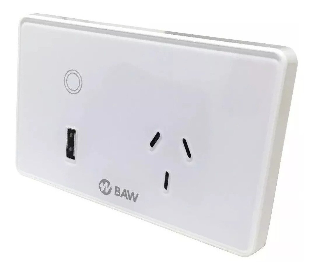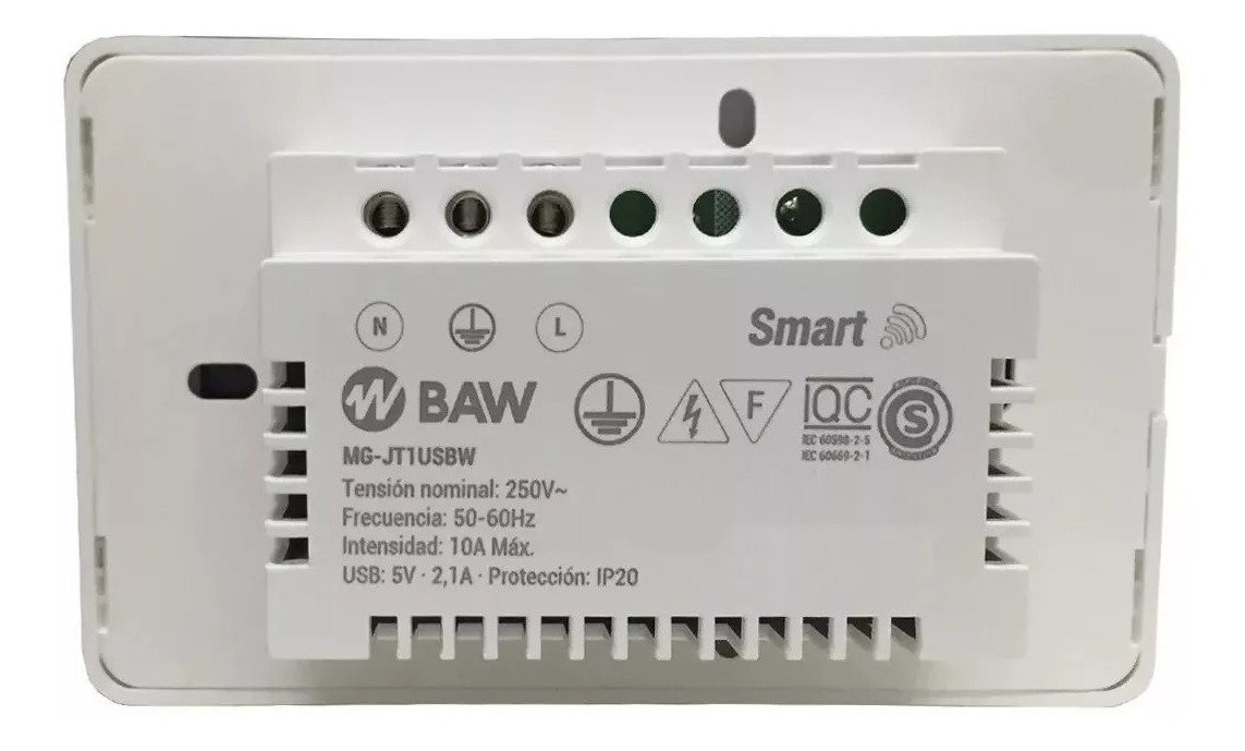 Tomacorriente IRAM 2071 con interruptor inteligente WIFI 2,4Ghz 802.11b/g/s mediante APP “SMARTLIFE” para iOS y Android, Echo Alexa y Google. Control de iluminación y/o dispositivos eléctricos o electrónicos mediante teléfono inteligente o tableta. Operación ON/OFF: Manual, horaria semanal. Temporización. Memoria. 100-240V 50-60Hz, 10A. Puerto de carga USB. Para embutir en caja rectangular: 100x50x50mm