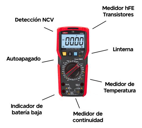 El UT89X es un multímetro digital de 6000 cuentas con medición de onda sinusoidal RMS. Capaz de medir resistencia, capacitancia, frecuencia, diodos, hFE, continuidad y NCV, temperatura y detección de voltaje sin contacto. Funcional en ambientes con poca luz gracias a su retroiluminación.
